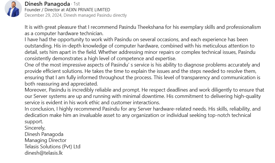 Worked on server installation and configuration, VMware environments, proxy and network systems, and IT solutions delivery for clients including John Keells, Maga, and Sri Lankan Government offices. Focused on infrastructure stability, automation support, and tailored technical solutions.